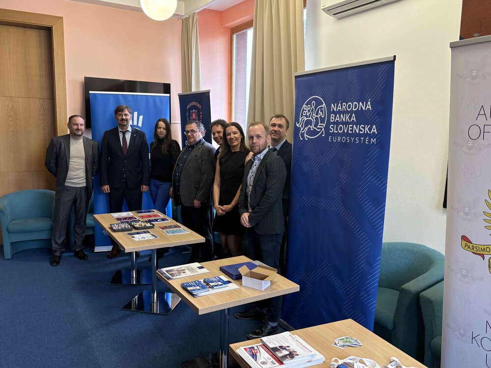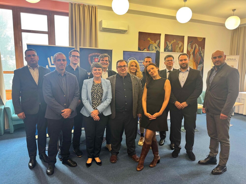 Zľava: JUDr. Attila Izsák, prokurátor odboru závažnej kriminality Generálnej prokuratúry Slovenskej republiky, JUDr. Peter Golha, prokurátor trestného odboru Generálnej prokuratúry Slovenskej republiky, JUDr. Mária Hansková, zástupkyňa riaditeľa trestného odboru Generálnej prokuratúry Slovenskej republiky,JUDr. Ing. Ladislav Majerník, vedúci oddelenia medzinárodného práva verejného a európskych záležitostí medzinárodného odboru Generálnej prokuratúry Slovenskej republiky, JUDr. Katarína Laiferová zástupkyňa riaditeľky medzinárodného odboru Generálnej prokuratúry Slovenskej republiky, JUDr. Adam Petrovič, PhD., prokurátor trestného odboru Generálnej prokuratúry Slovenskej republiky, JUDr. Boris Suchovský, hlavný inšpektor dohľadu oddelenia kryptoaktív a inovácií odboru finančných technológií a inovácií Národnej banky Slovenska